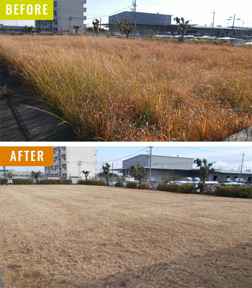 年2回、事務所周りの雑草を刈っており、作業に入るタイミングはお客様のGOサインに基づいて実施しています。
